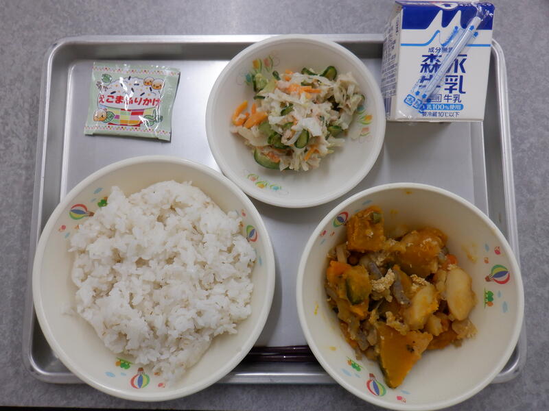 今日の給食は麦ごはん、かぼちゃのうま煮、和風サラダ、えごまふりかけ、牛乳でした。