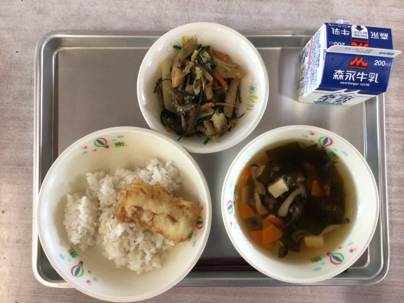 今日の給食は、麦ごはん、牛乳、すまし汁、いか天ぷら、昆布とじゃがいものきんぴらでした。