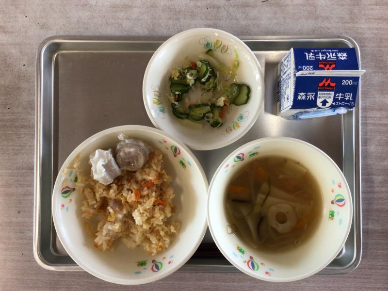 今日の給食は、キムチチャーハン、牛乳、ワンタンスープ、シュウマイ、ピリからきゅうりでした。