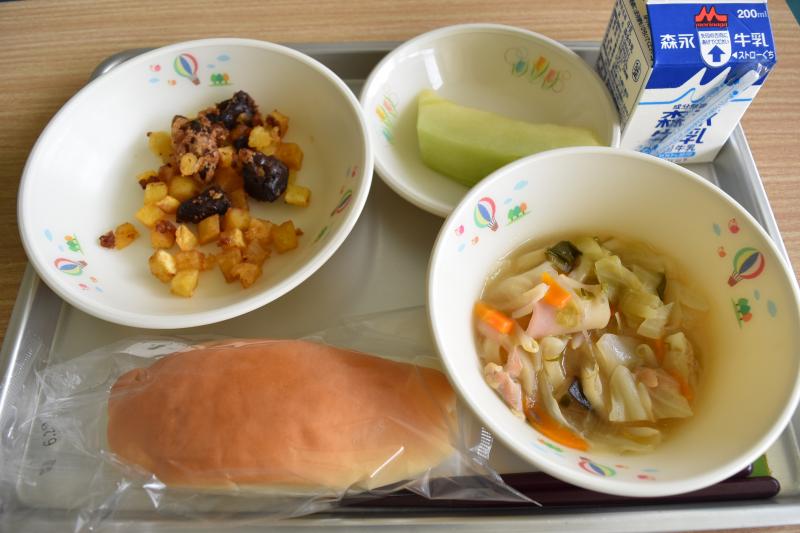 今日の給食は、コッペパン、牛乳、さいめん、おさつレバー、メロンでした。
