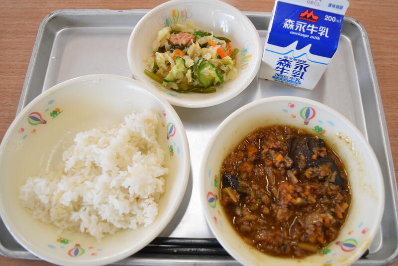今日の給食は、麦ごはん、牛乳、マーボーなす、くきわかめのサラダでした。
