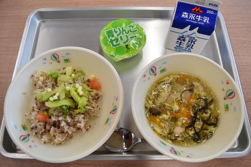 今日の給食は、タコライス、牛乳、もずく入りかきたま汁、青りんごゼリーでした。