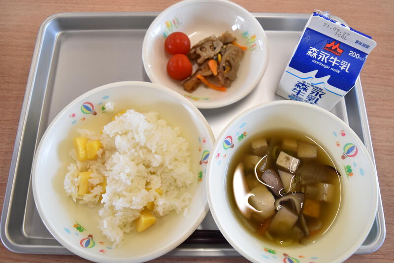 今日の給食は、くりごはん、牛乳、つぼん汁、レンコンのきんぴら、ミニトマトでした。
