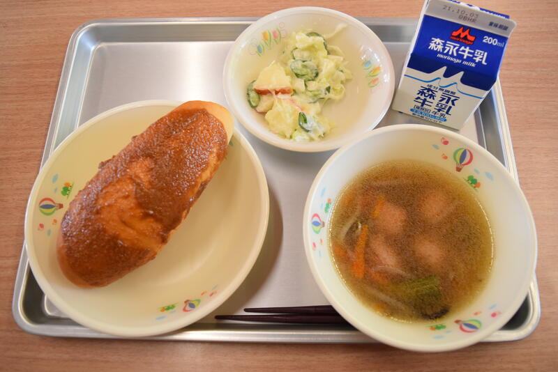 今日の給食は、にんじんパン、牛乳、豆とウィンナーの豆乳スープ、イタリアンサラダでした。