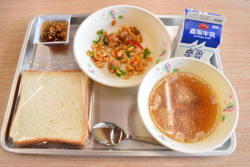今日の給食は、食パン、牛乳、とうがんスープ、鶏肉のピーナツがらめ、麦茶ゼリーでした。