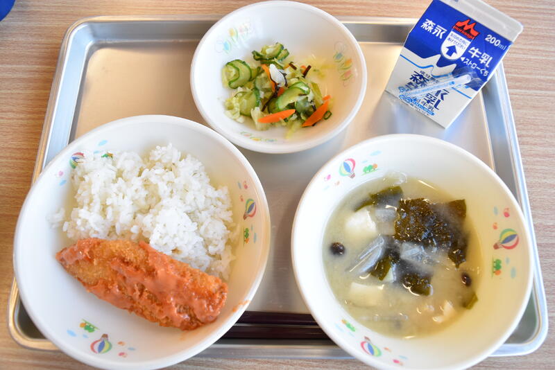 今日の給食は、麦ごはん、牛乳、冬野菜のみそ汁、魚のオーロラソースかけ、昆布あえでした。