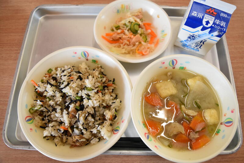 今日の給食は、ひじきご飯、牛乳、さつま汁、大根の和え物でした。