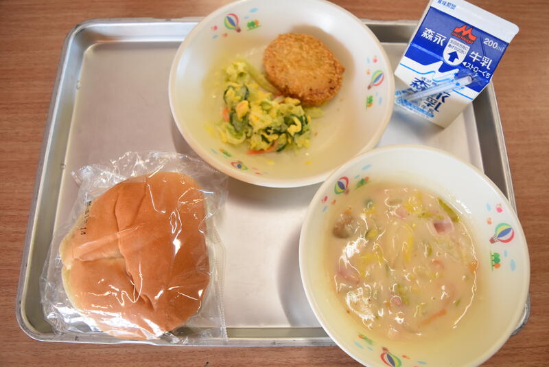 今日の給食は、丸パン、牛乳、白菜のクリーム煮、枝豆と豆腐のミンチカツ、たまごサラダでした。