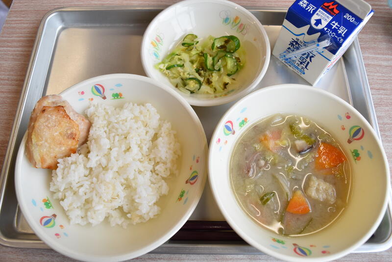 今日の給食は、麦ごはん、牛乳、豚汁、鶏の塩こうじ焼き、高菜和えでした。