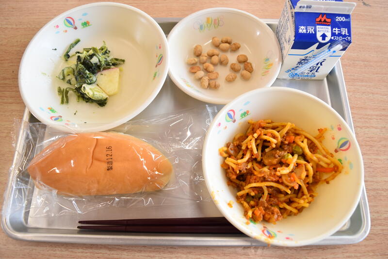 今日の給食は、コッペパン、牛乳、ミートスパゲティ、ポパイサラダ、黒糖ビーンズでした。