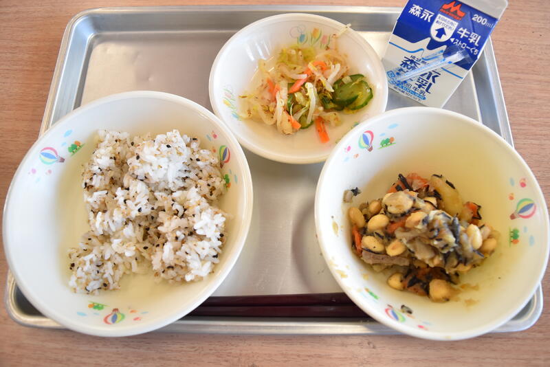 今日の給食は、ごまご飯、牛乳、大豆のいそに、おかかあえでした。