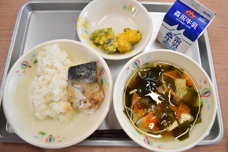 今日の給食は、麦ごはん、牛乳、豆腐のすまし汁、魚のゆずみそ煮、かぼちゃサラダでした。