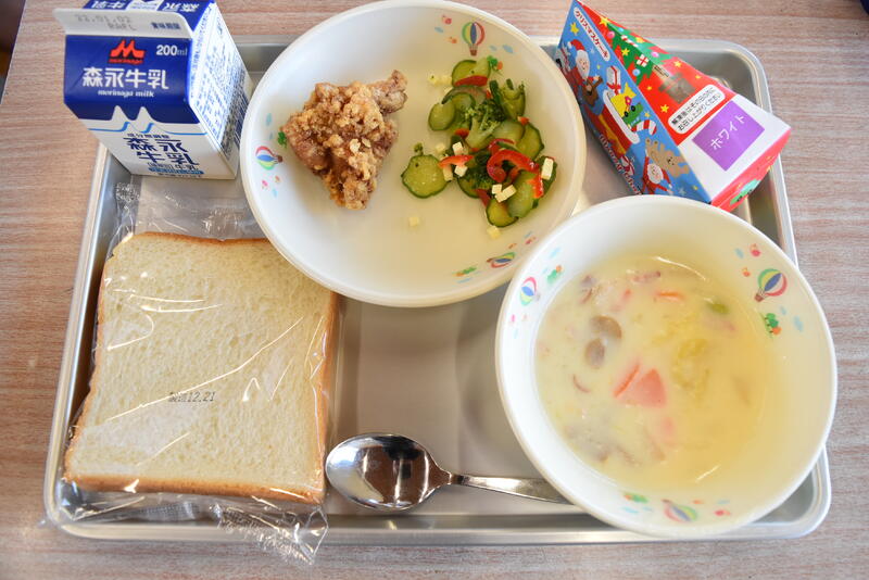 今日の給食は、食パン、牛乳、さつまいもの米粉シチュー、鶏のからあげ、もみの木サラダ、セレクトデザートでした。