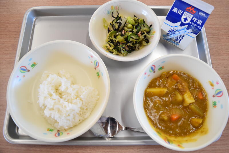 今日の給食は、麦ごはん、牛乳、冬野菜カレー、ひじきと枝豆のサラダでした。