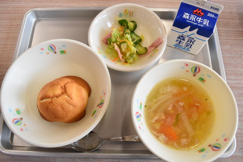 今日の給食は、UFOパン、牛乳、野菜スープ、りんごサラダでした。