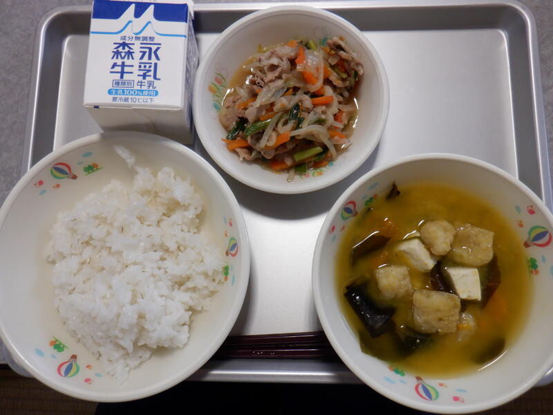 今日の給食は麦ごはん、かぼちゃのみそ汁、豚にら炒め、牛乳でした。