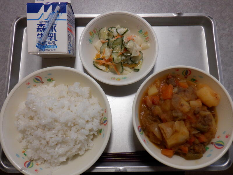 今日の給食は麦ごはん、カレー入り肉じゃが、冬瓜サラダ、牛乳です。