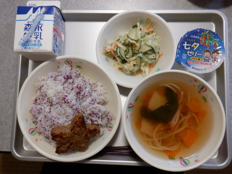 今日の給食はゆかりごはん、七夕汁、星型ハンバーグ、コールスローサラダ、七夕ゼリー、牛乳でした。
