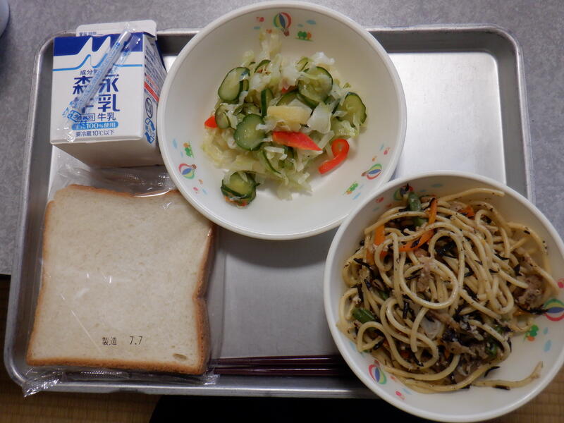 今日の給食は食パン、ひじきスパゲティ、パインサラダ、牛乳でした。