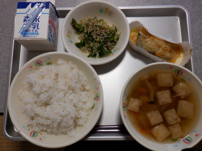 今日の給食は麦ごはん、きのこのおすまし、魚の黄金焼き、ピーマンのじゃこ和え、牛乳でした。