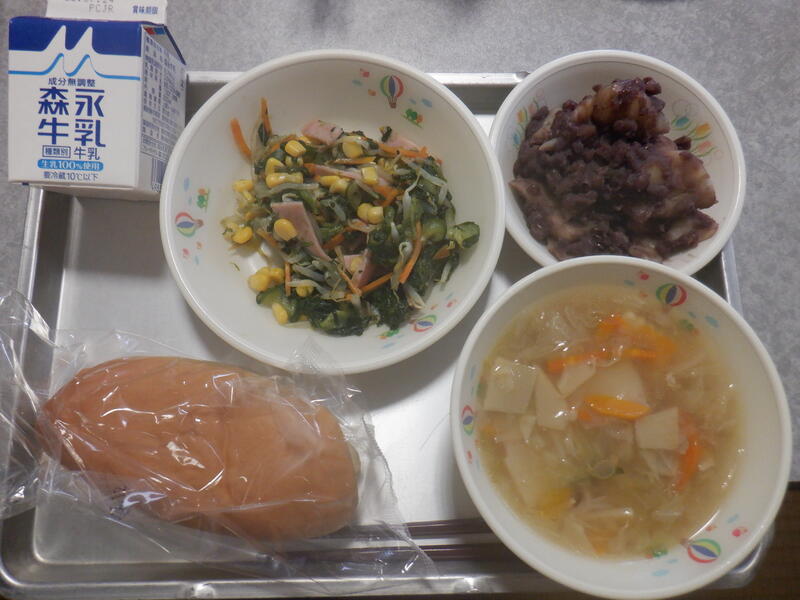 今日の給食はコッペパン、八宝菜、中華和え、あんこかし、牛乳でした。