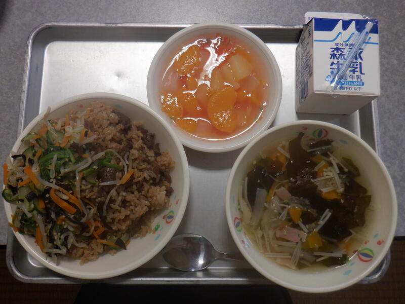 今日の給食はビビンバ、わかめスープ、フルーツジュレ、牛乳でした。