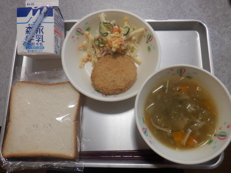 今日の給食は食パン、冬瓜とえびのスパイシ―スープ、枝豆と豆腐のミンチカツ、マカロニサラダでした。