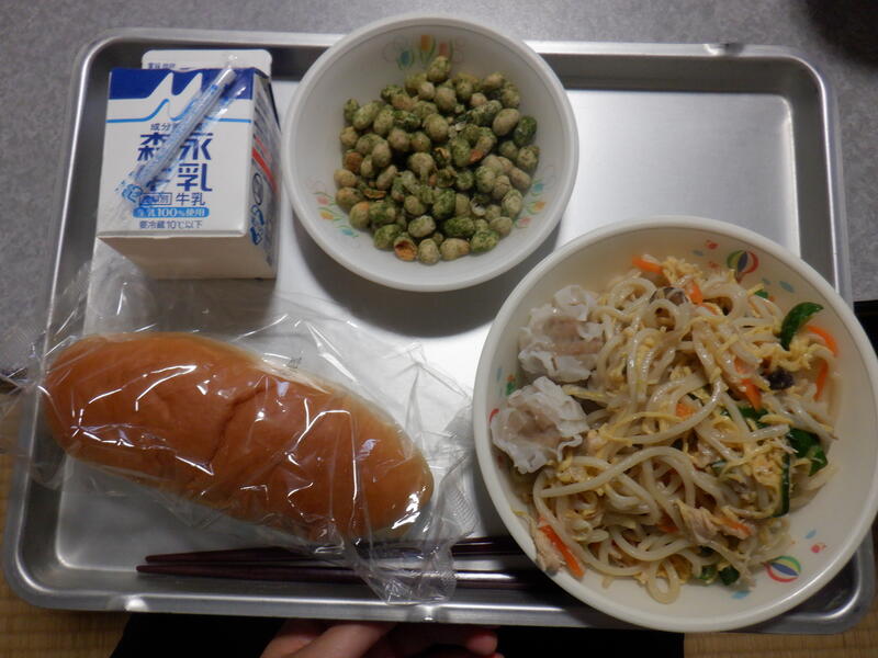 今日の給食はミルクパン、冷やし中華、シュウマイ、抹茶豆、牛乳でした。