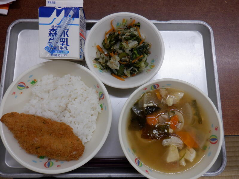 今日の給食は麦ごはん、冬瓜汁、鯛のフライ、磯和え、牛乳です。