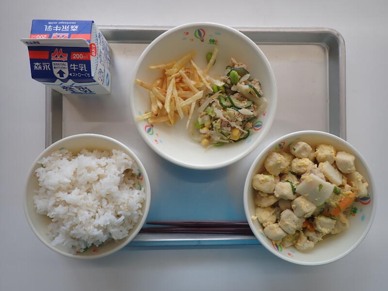 きょうのこんだては、むぎごはん、こうやどうふのたまごとじ、あげじゃがサラダでした。