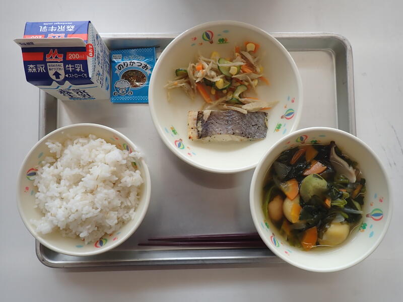 きょうの献立は、むぎごはん、おやさいつみれじる、さかなハーブやき、ごぼうサラダでした。