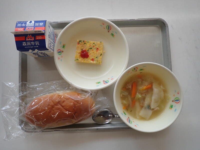きょうの献立は、ミルクパン、ラビオリスープ、チーズオムレツでした。