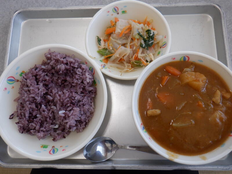 今日の給食は古代米ごはん、チキンカレー、こんにゃくサラダ、牛乳でした。
