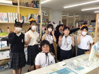 本校図書室のハロウィンです。図書委員会のみんなが仮装し、本を借りに来る友だちを楽しませてくれました!