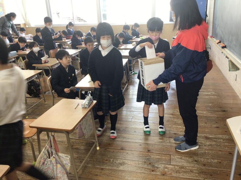 3月4日(月)次年度の若葉会長選出のための全校児童による総選挙が行われました。8人の立候補者の立ち会い演説も立派で、流石でした。また、1週間の選挙運動も朝から昼休みと全力でした。明日の全校集会で会長発表です。最多得票者が会長で、後の7人は若葉会副会長となります。激戦でしたが、後は力を合わせ、「いい声・いい顔・いい心」の山鹿小を創っていってくれると信じています。