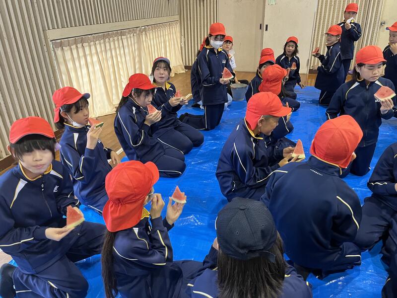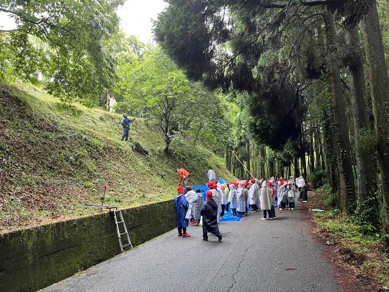 5月30日(火)小雨の降る中でしたが、川辺地区の皆様の熱い思いと深い愛情で、伝統の梅ちぎりを実施することができました。美味しいスイカもいただき、子供たちも大満足でした。雨の梅ちぎりも貴重な体験となったと思います。