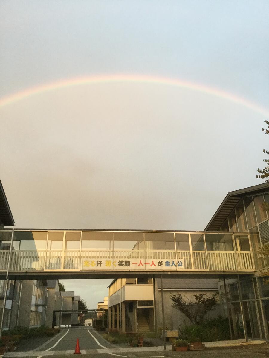 本日の朝、本年度の運動会テーマの上に見事な虹が輝いていました!