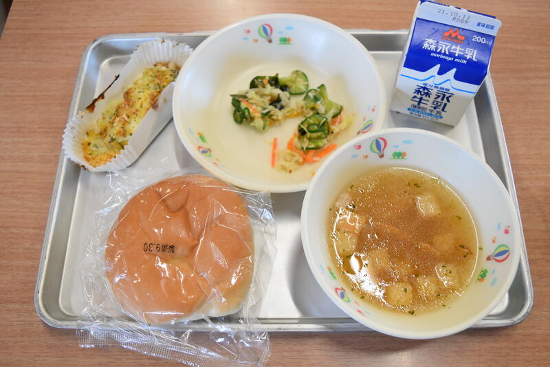 今日の給食は、丸パン、牛乳、オニオンスープ、魚のこうそうやき、ささみのごまサラダでした。