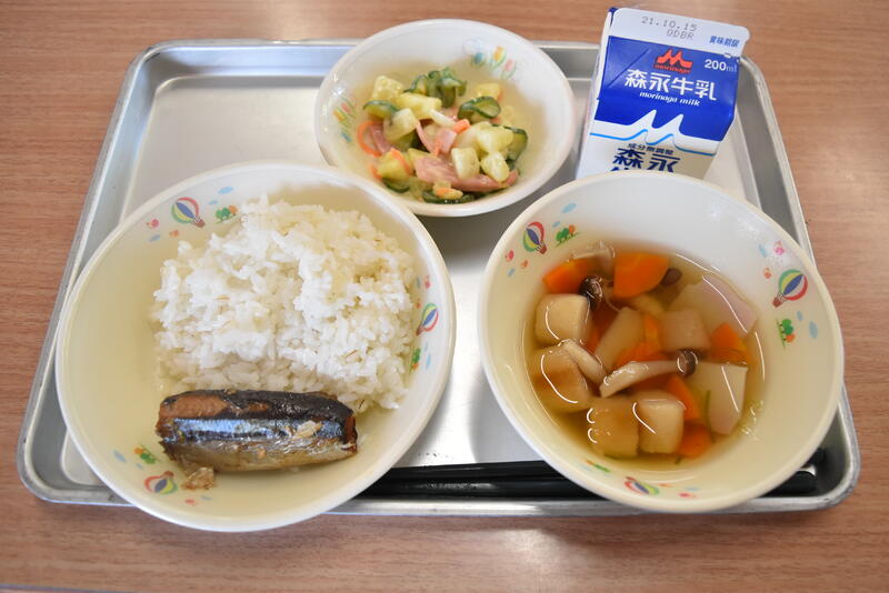 今日の給食は、麦ごはん、牛乳、おふのすまし汁、さんまのかんろ煮、さつまいものサラダでした。