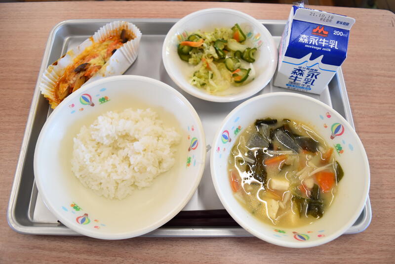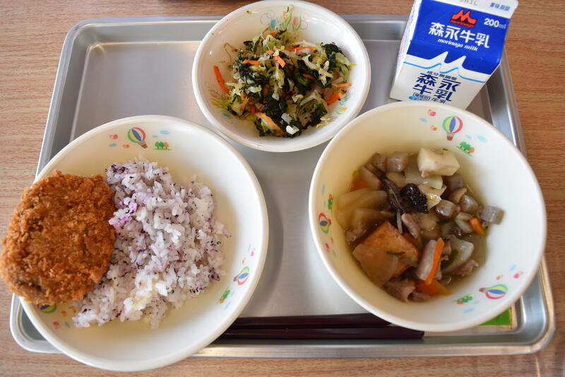 今日の給食は、ゆかりご飯、牛乳、のっぺい汁、馬肉コロッケ、いそ和えでした。