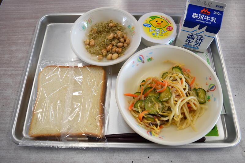 今日の給食は、食パン、牛乳、冷やし中華、豆ちりめん、レモンゼリーでした。