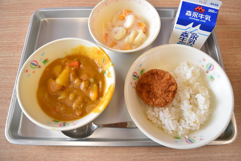 今日の給食は、カツカレー、牛乳、フルーツヨーグルトゼリーでした。