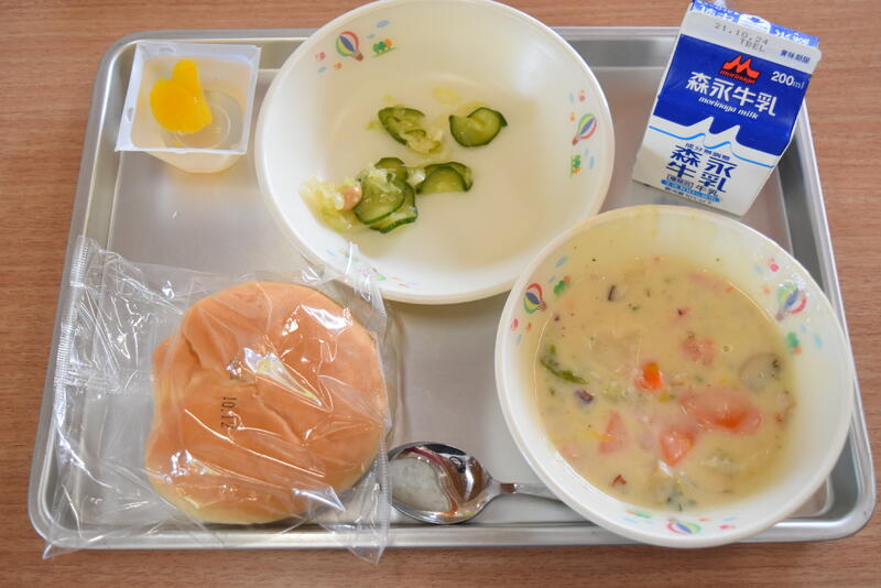 今日の給食は、丸パン、牛乳、秋野菜のシチュー、ビーンズサラダ、手作りみかんゼリーでした。