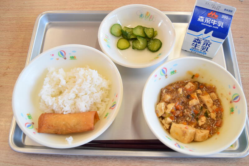 今日の給食は、麦ごはん、牛乳、麻婆豆腐、ミニ春巻き、きゅうりの中華和えでした。