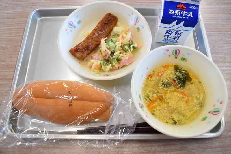 今日の給食は、セルフドッグ、牛乳、たまごスープ、マカロニサラダでした。