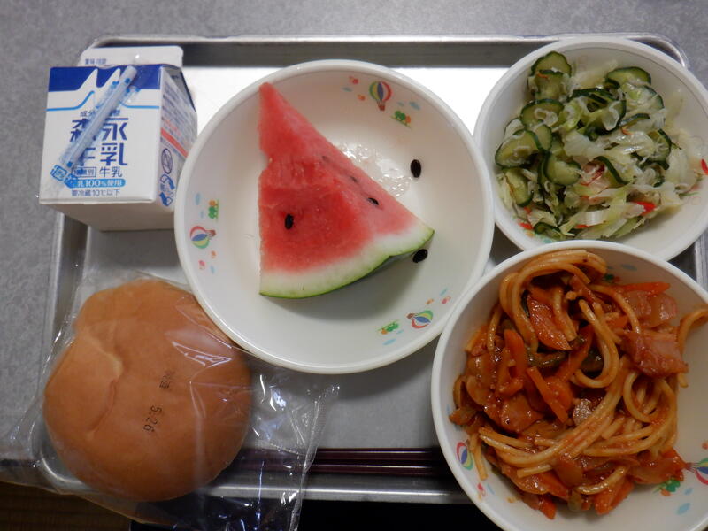 今日の給食は丸パン、スパゲティナポリタン、じゃこサラダ、すいか、牛乳でした。