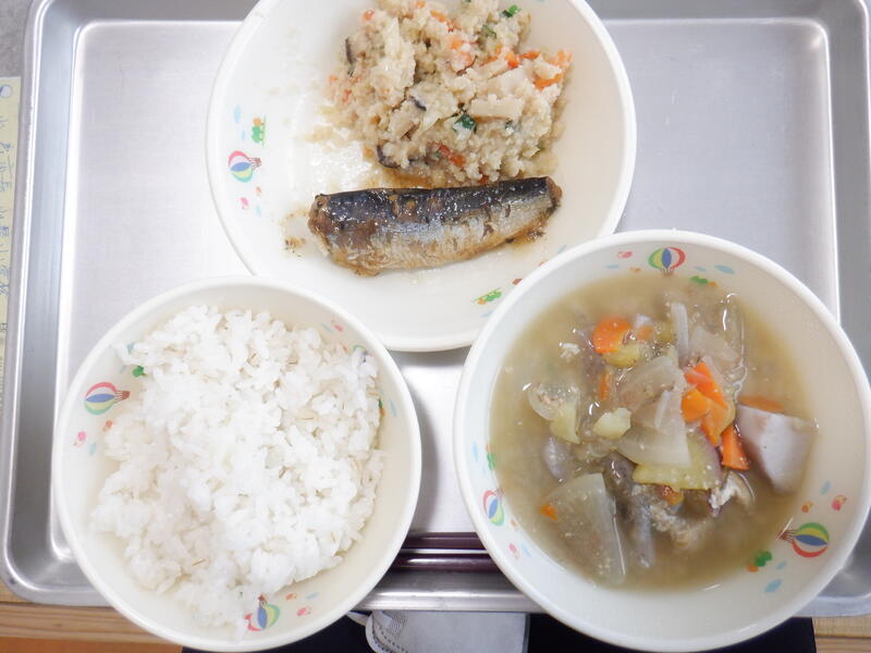 今日の給食は麦ごはん、根菜汁、鰯の梅煮、卯の花和え、牛乳でした。