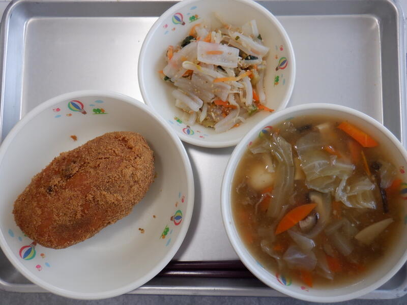 今日の給食はきなこ揚げパン、八宝菜、こんにゃくサラダ、牛乳でした。