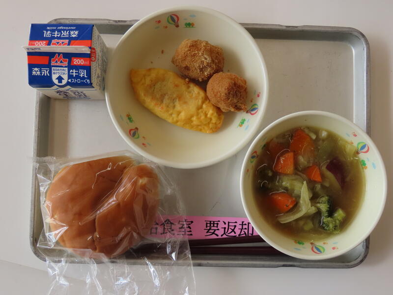 今日の献立は、パインパン、ポトフ、トマトオムレツ、3時のドーナツコラボドーナツでした。
