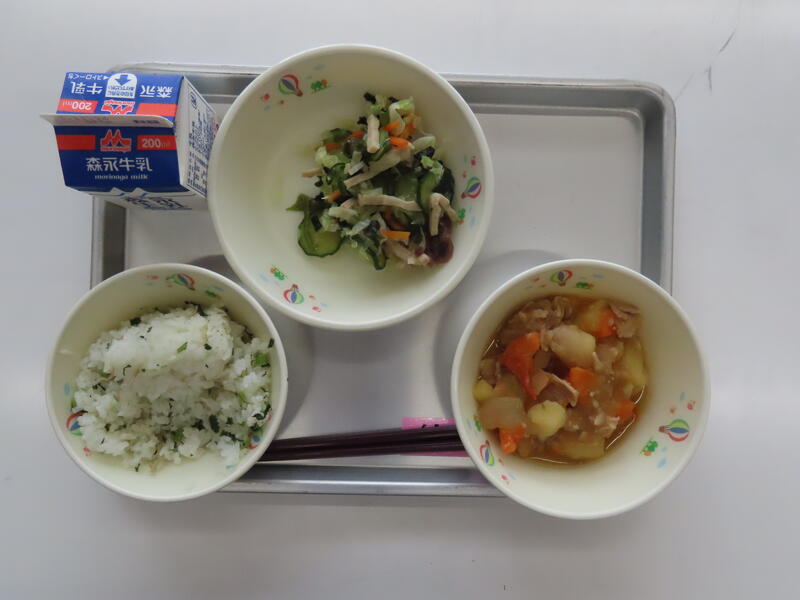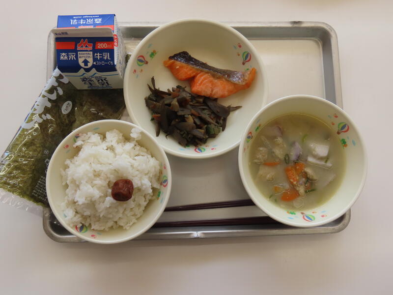 本日の献立は、セルフおにぎり、ごまみそしる、しおさけ、きんぴらでした。